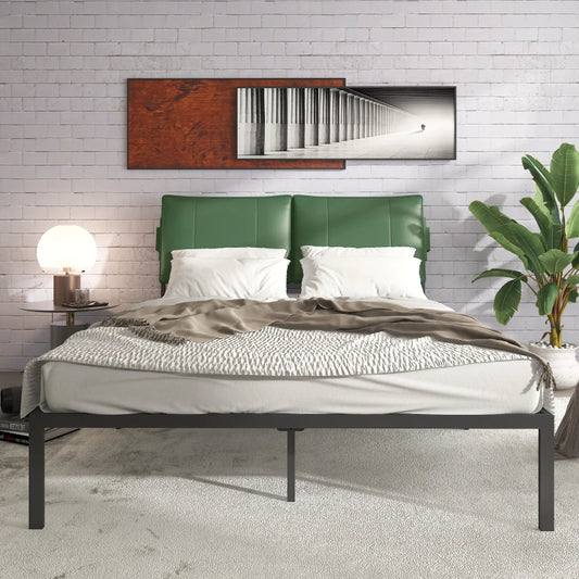 Modern Queen Size Metal Bed Frame with Leathaire Headboard,Metal Slats Support, Retro Green