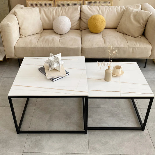 Modern Nesting Coffee Table Set of 2 for Living Room Center Office, Square Marble Cocktail Table with Stackable, White/Black