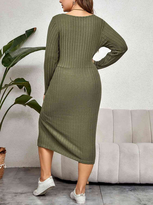 Plus Size Ribbed Round Neck Twisted Slit Midi Dress