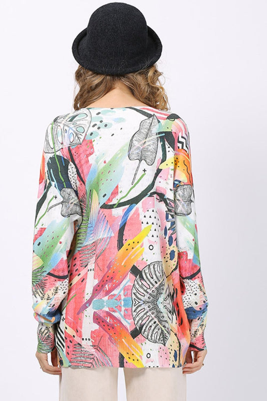 Printed Round Neck Long Sleeve Blouse and Distressed Jeans Set