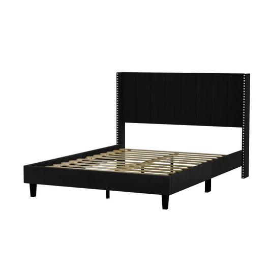 Queen Size Tufted Upholstered Bed Frame Low Profile Velvet Bed Frame Platform with Raised Wingback Headboard Wood Slat Support