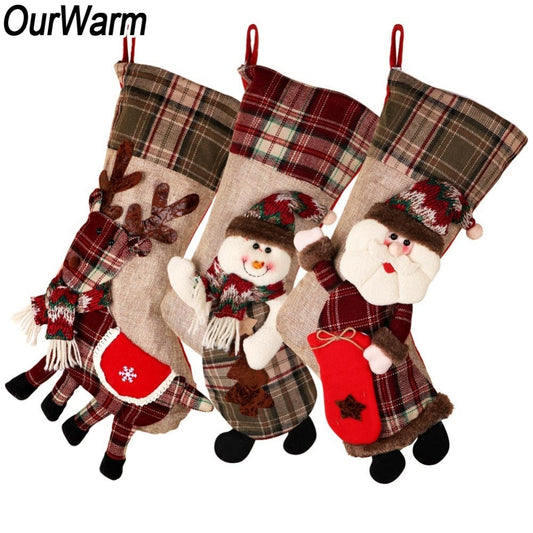 Warm Large Christmas Stocking Santa Claus Sock Plaid Burlap Gift Holder Christmas Tree Decoration New Year Gift Candy Bags