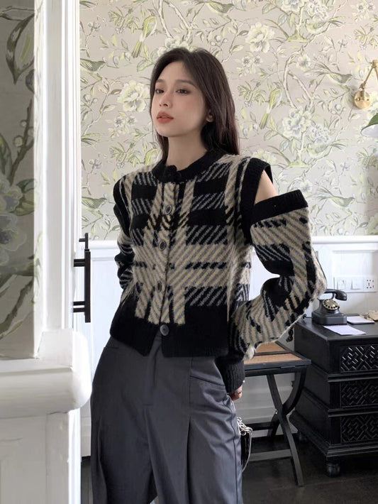 Women Plaid Designer Hollow Out Full Sleeve Spring Autumn Sweater Fashion High Street Casual Vintage Knitting Pullover
