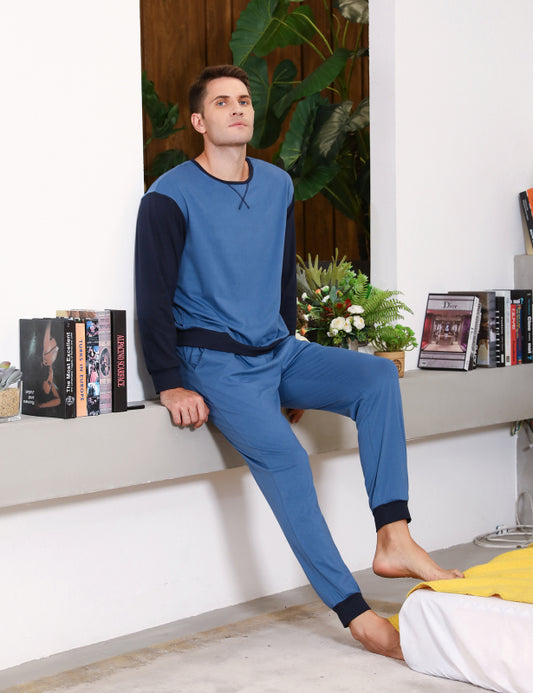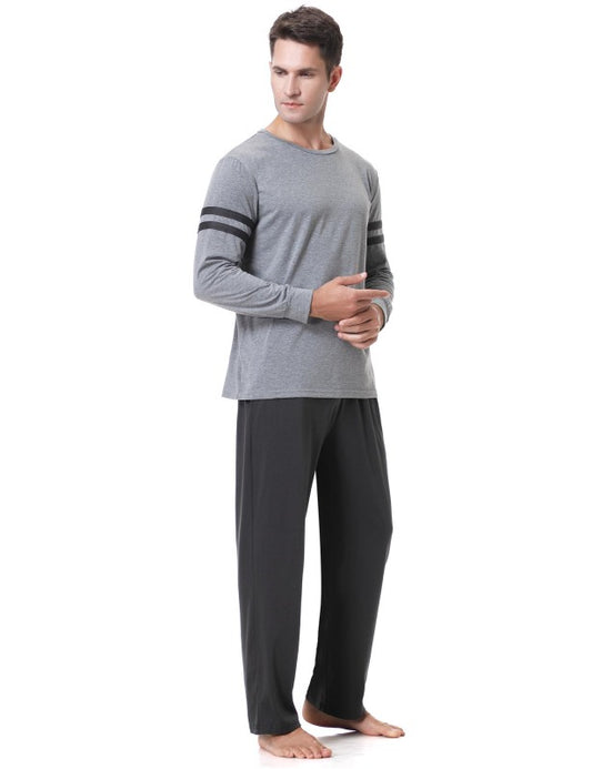 Men's Slim Striped Print Crew Neck Button Long Sleeve Trousers One Piece Pajama