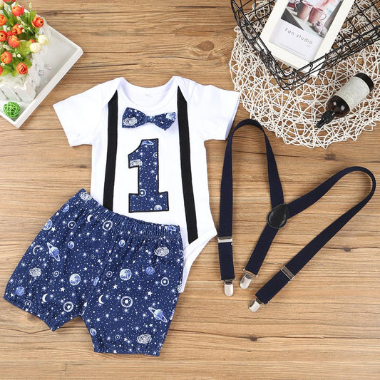 Newborn Baby Boys Gentleman Clothing Set Short Sleeve Letter Romper Tops Straps Shorts Outfits 1st Birthday Clothes for Babies