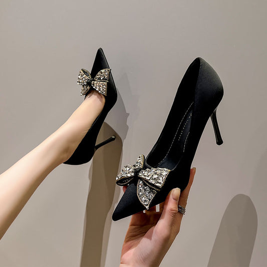 法式气质蝴蝶结高跟鞋女2024新款春季细跟浅色水钻婚鞋黑色单鞋女