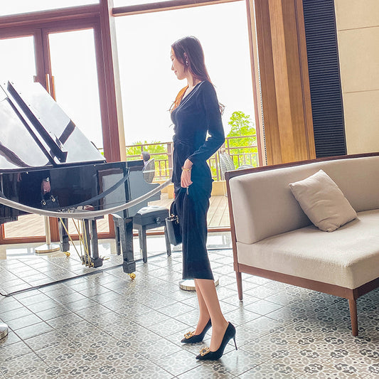 高跟鞋女2023年新款网红爆细跟气质名媛百搭方扣尖头大码单鞋秋季