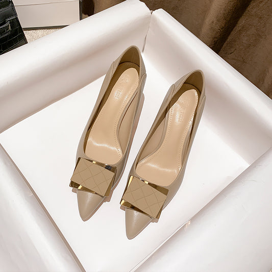 法式高跟鞋气质软皮不磨脚尖头米白色百搭小跟单鞋女2024春秋新款
