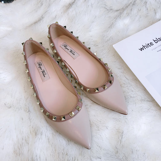 真皮铆钉鞋子女2024春秋新款尖头浅口平底V家软底瓢鞋柳丁单鞋女