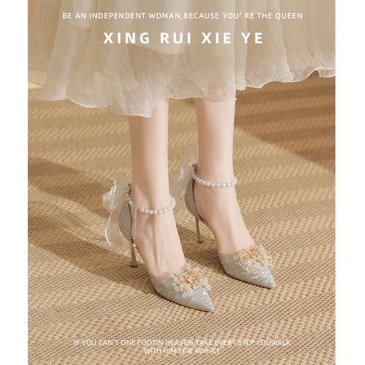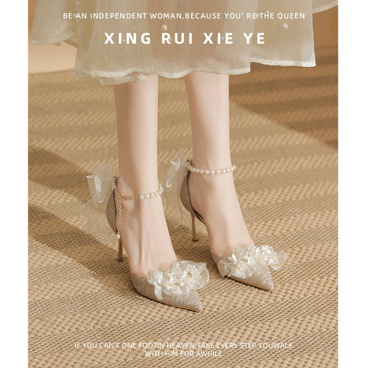 珍珠蝴蝶结高跟鞋女18岁成年礼细跟高级感不累脚仙女花朵婚纱婚鞋