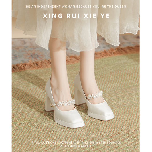 浅色主纱婚鞋粗跟不累脚平时可穿防水台缎面珍珠玛丽珍高跟鞋9cm