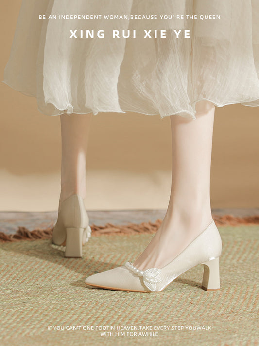 法式珍珠订婚婚鞋新娘鞋不累脚粗跟尖头旗袍礼服国风高跟鞋女浅色