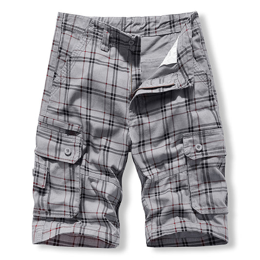 Work Shorts men's fashion sports washed pure cotton plaid Multi Pocket six point casual pants