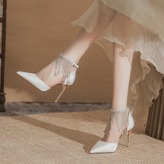 水钻蝴蝶结高跟凉鞋2024夏季白色婚纱鞋尖头名媛细跟扣带单鞋黑色