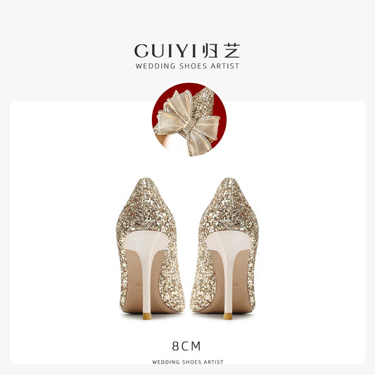 归艺高级感主婚纱婚鞋夏季女新款新娘鞋水晶婚礼高跟鞋金色亮片鞋