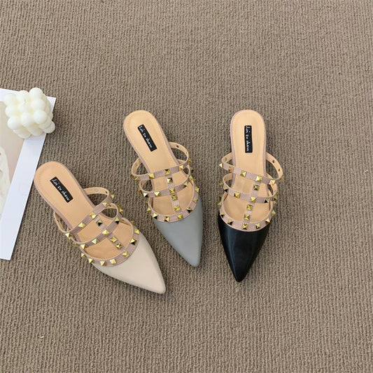 法式小众仙女风粗跟凉拖鞋女外穿2024年春夏绝美包头铆钉低跟凉鞋