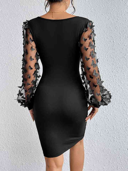 Butterfly Applique Lantern Sleeve V-Neck Mini Dress