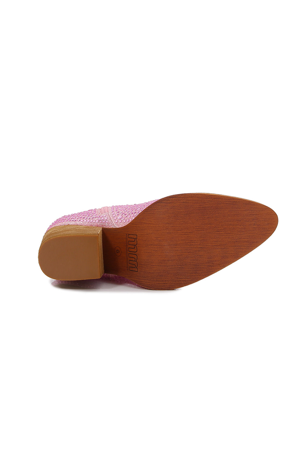 These boots feature a classic cowboy silhouette with a modern twist, boasting an eye-catching array of rhinestones adorning the Boots overall. The pointed toe and stacked heel offer both elegance and comfort, making them a versatile choice for any occasion, whether you're hitting the dance floor or adding a statement piece to your everyday ensemble.