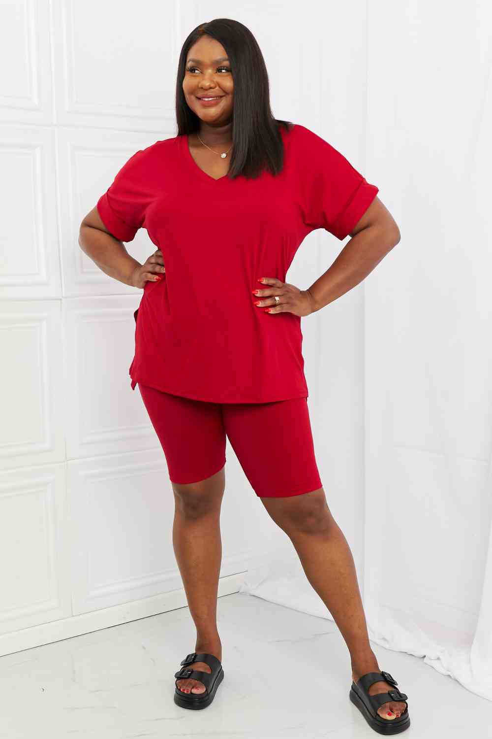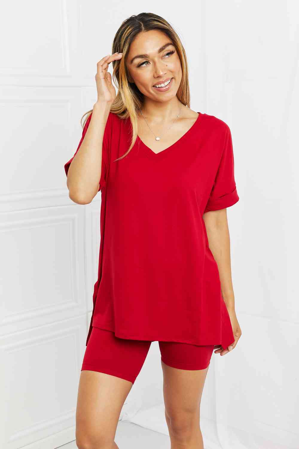 Quiet moments may be few and far between but comfort doesn't have to be! Your skin will love this set, which comes with a brushed DTY microfiber top and biker shorts. The high-low hem top allows for an easy front tuck to emphasize your waist, and the high rise biker shorts were made for comfort. Mix and match or wear together.