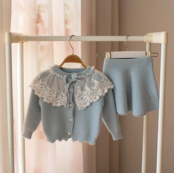 Autumn Winter Children's Sweater Set Girls' Lace Solid Color Long Sweater +Short Skirt 2PCS Girls Clothes Suit