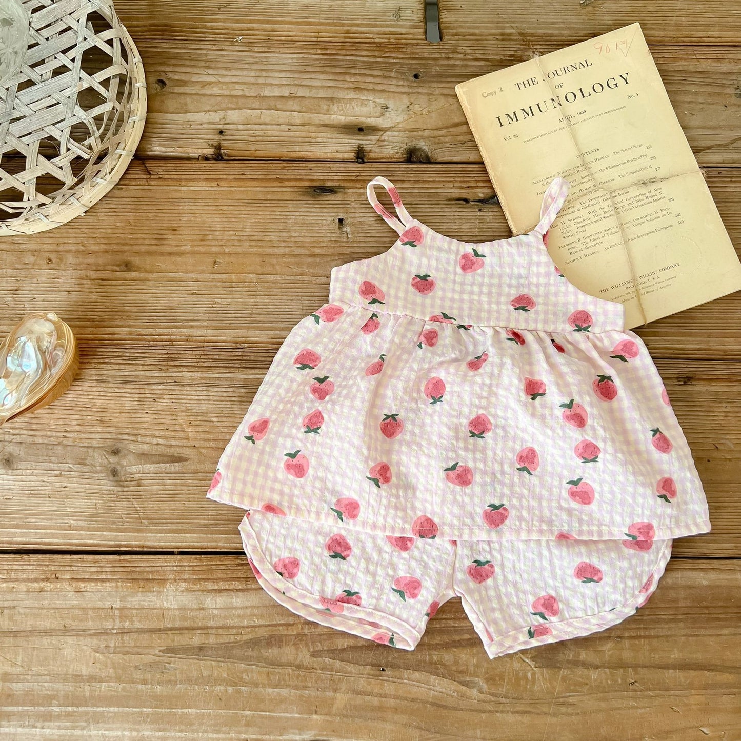 Baby Summer Full Print Bear Strawberry Sleeveless Suspender Top Shorts Two-Piece Cute Baby Summer Suit