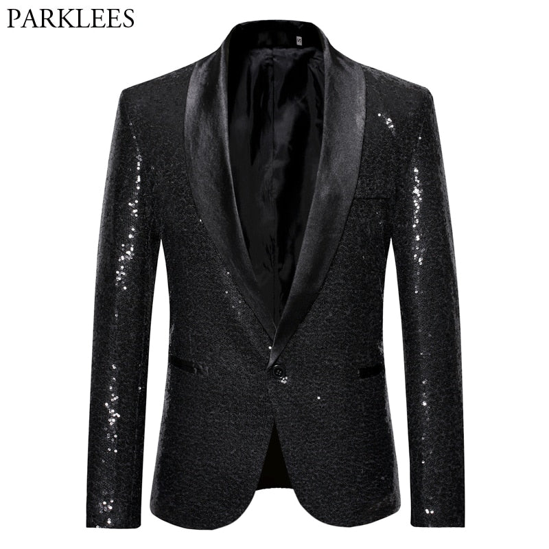 Black Sequin One Button Shawl Collar Suit Jacket Men Bling Glitter Nightclub Prom DJ Blazer Jacket Men Stage Clothes for Singers