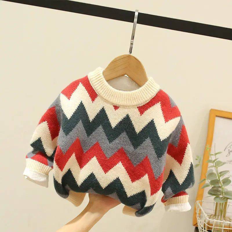 Children's corrugated foreign sweater boys and girls 2022 autumn and winter clothing baby plus velvet sweater children's warm line clothing trend