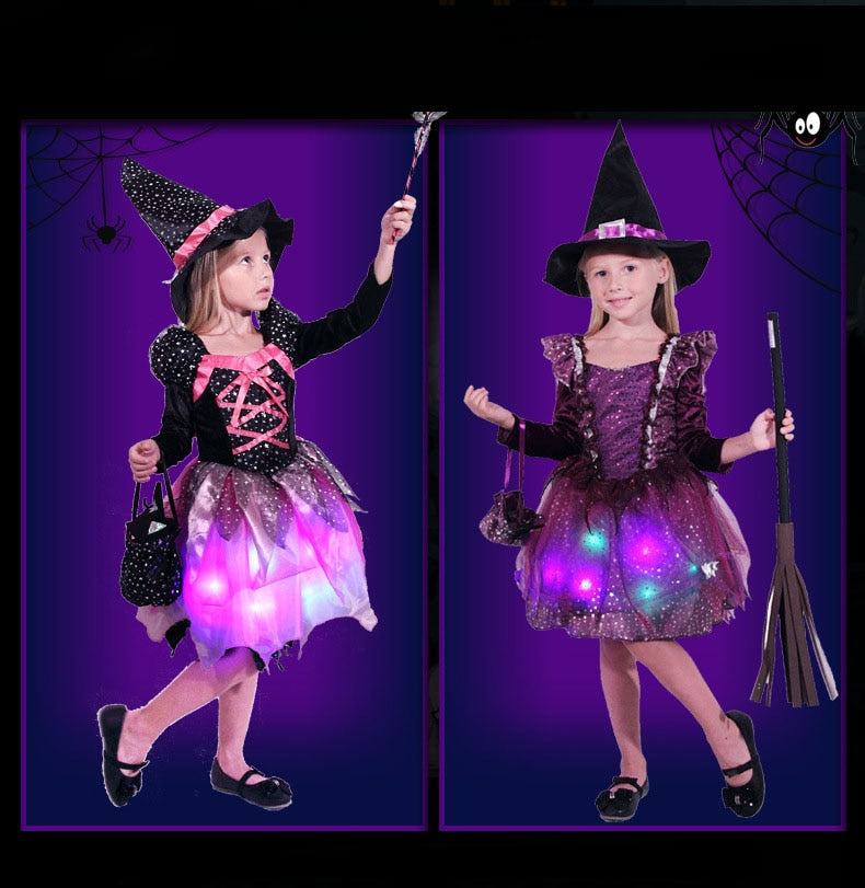 Girl Child LED Glow Light Witch Costume Cosplay Glowing Dress Carnival Birthday Party Gift Wizard Hat Halloween Costume for Kids