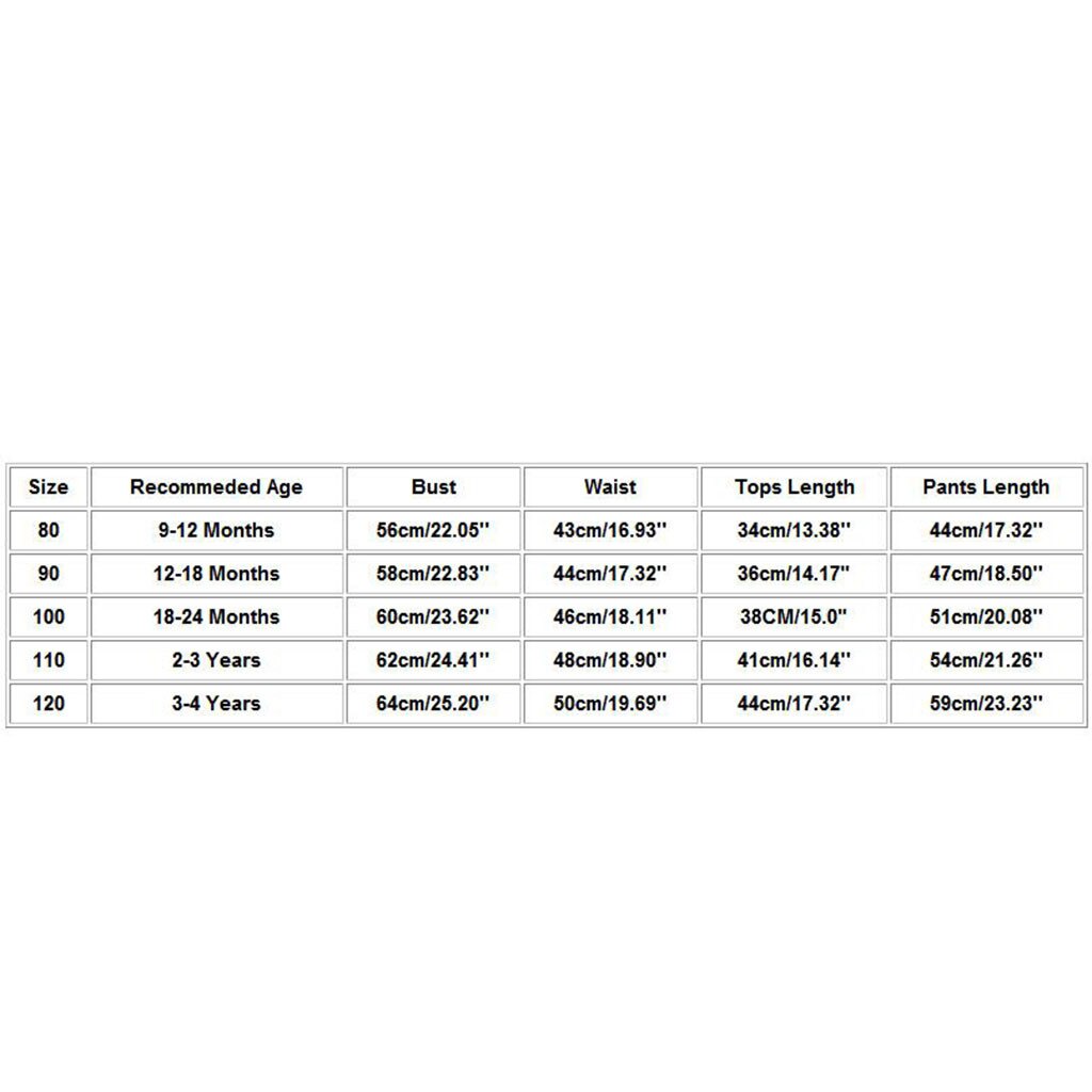 | Size | Recommeded Age | Bust | Waist | Tops Length | Pants Length |