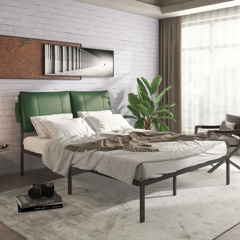 Queen Size Metal Bed Frame with Leathaire Headboard,Metal Slats Support, Green |