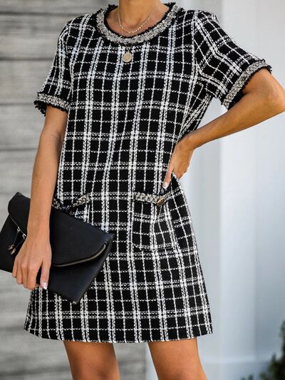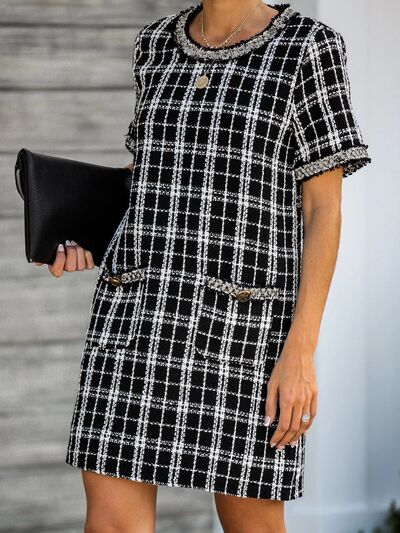 Pocketed Plaid Round Neck Short Sleeve Dress