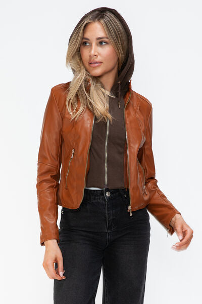 Snobbish Faux Leather Zip Up Drawstring Hooded Jacket