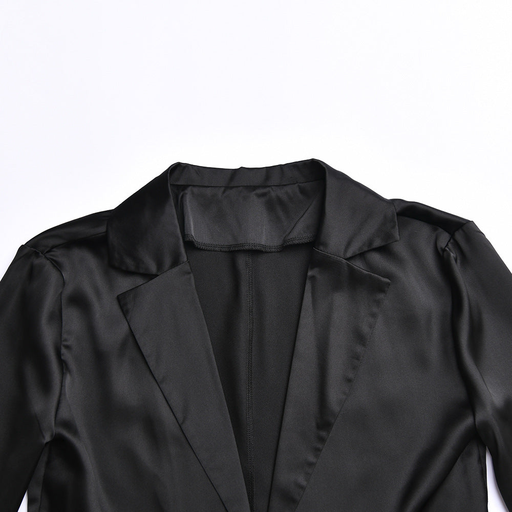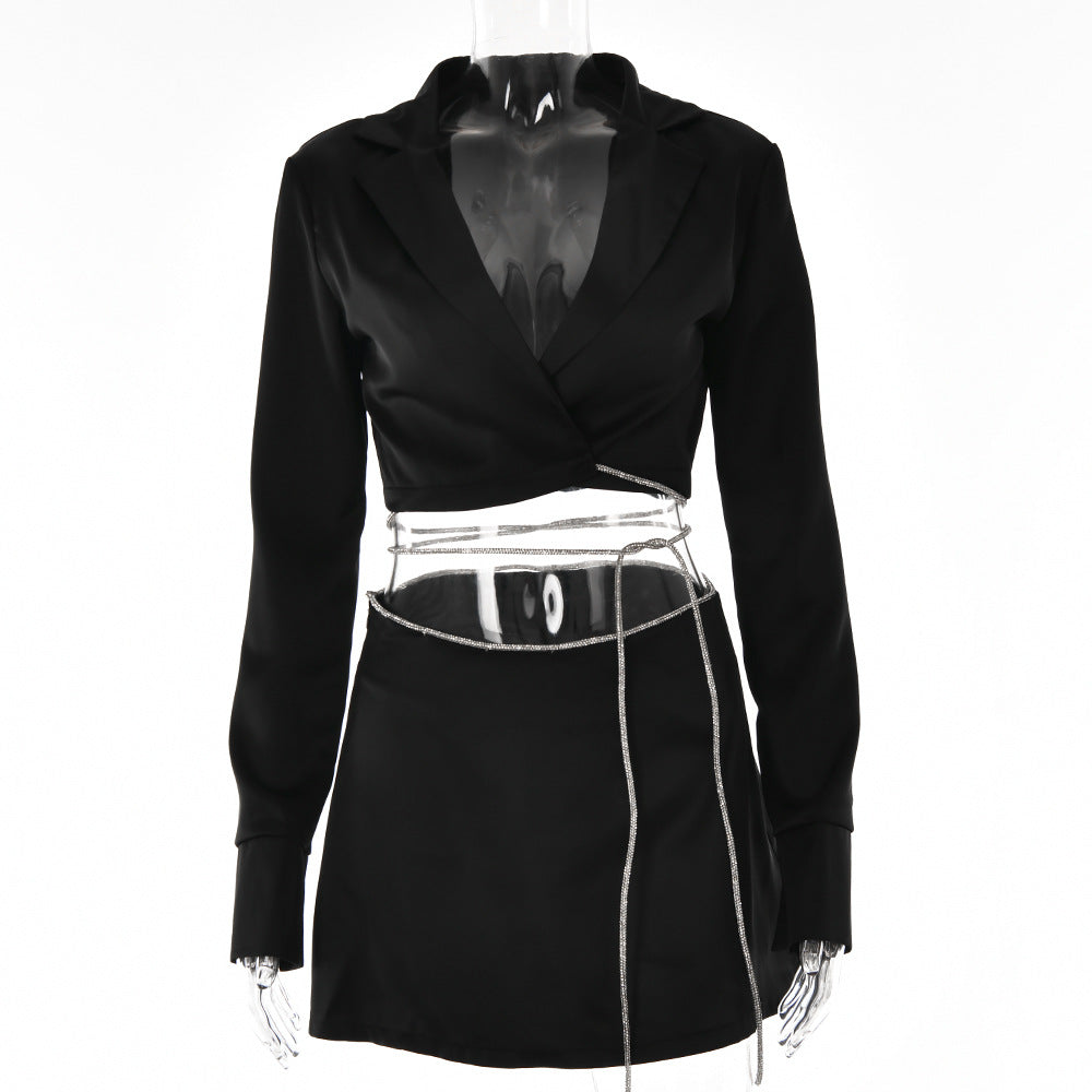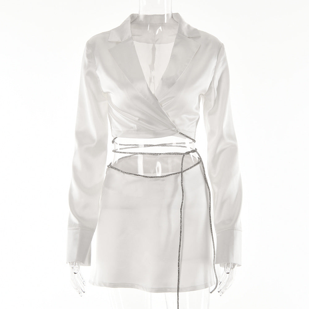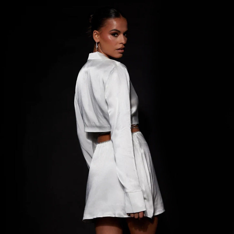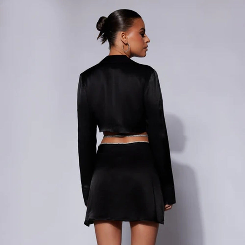 Spice Girls slim Rose Satin high waist lace up short skirt long sleeve cardigan two piece set for women