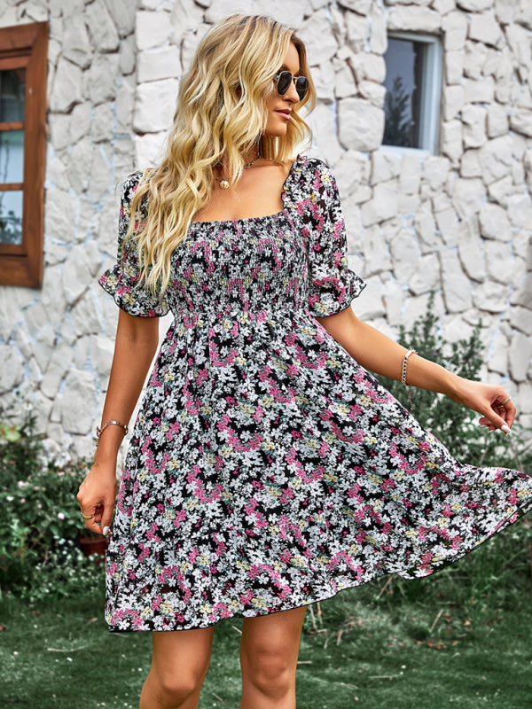 Women's French square collar skirt short sleeve Floral Dress